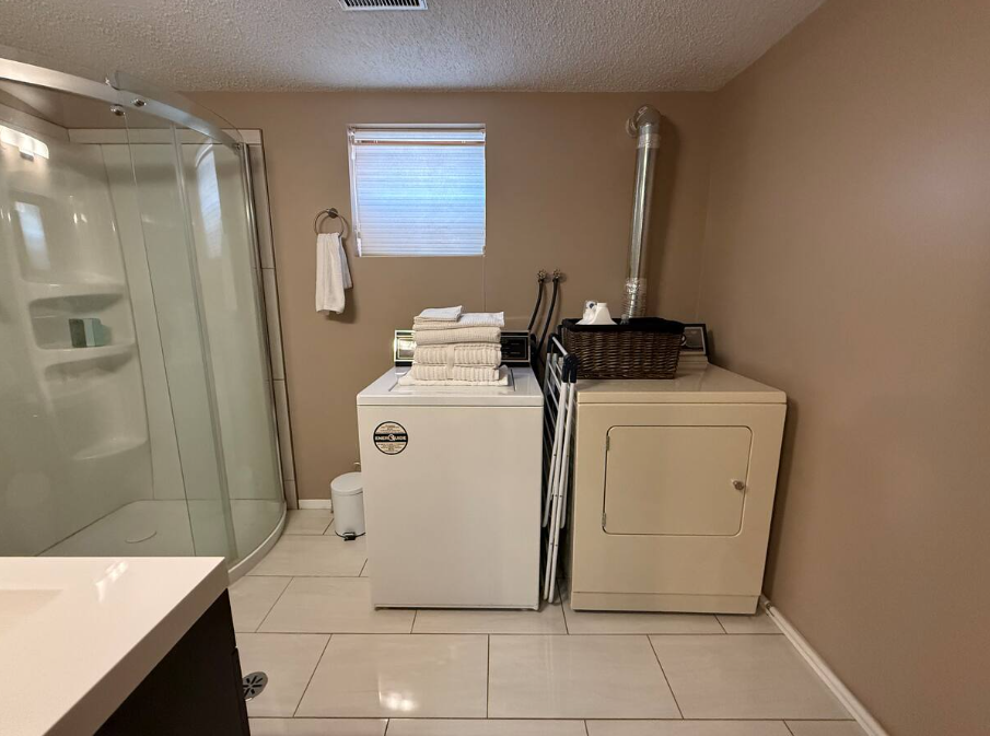 There is a washer and dryer in the basement bathroom that you may use during your stay with us for your personal laundry.